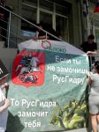 «Русгидра, руки прочь от Волги»,во главе с Георгием Победоносцем надпись «Если ты не замочишь РусГидру, то РусГидра замочит тебя». И действительно – тут же изображение гидры-драконас тремя головами под струями воды из бутылок растеклось уже в течении 5 минут. Этим пикетчики продемонстрировали, что все вместе справимся с ненавистным проектом подъема воды в Волге на 68 м.